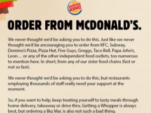 “Haced pedidos al McDonald´s”, así titula la división de Reino Unido de Burger el mensaje de Twitter, que ha corrido como la pólvora por las redes sociales. “Nunca creímos que os llegaríamos a pedir que hicieseis esto”, asegura el comunicado. “Nunca llegamos a pensar que os animaríamos a hacer pedidos a KFC, Subway, Domino’s Pizza, Pizza Hut, Five Guys, Greggs, Taco Bell, Papa John’s, Leon… o cualquiera de los restaurantes de comida independientes que no hemos mencionado”.