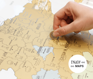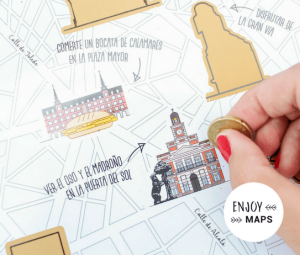 La idea es relativamente sencilla, pero muy atractiva. El propietario del mapa puede rascar aquel lugar al que ha viajado y así descubre un color diferente por cada enclave y un monumento representativo de la zona. Es un formato similar al “rasca y gana” de los sorteos.