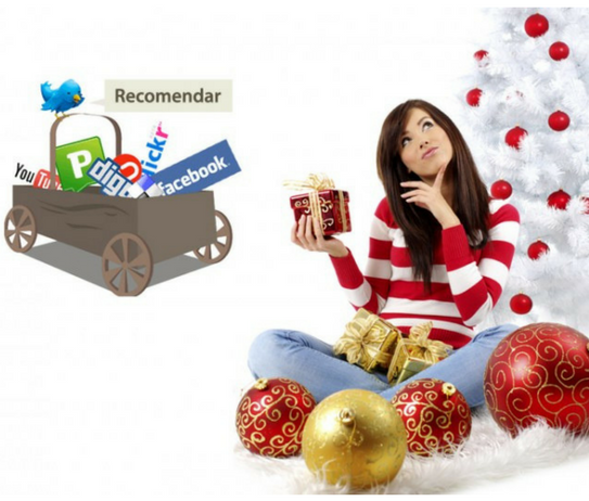 mujer con motivos navideños y carro de redes sociales